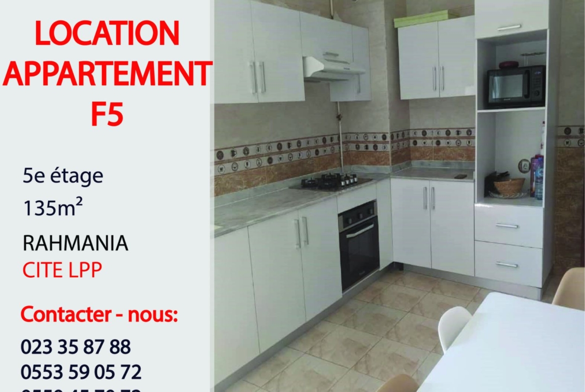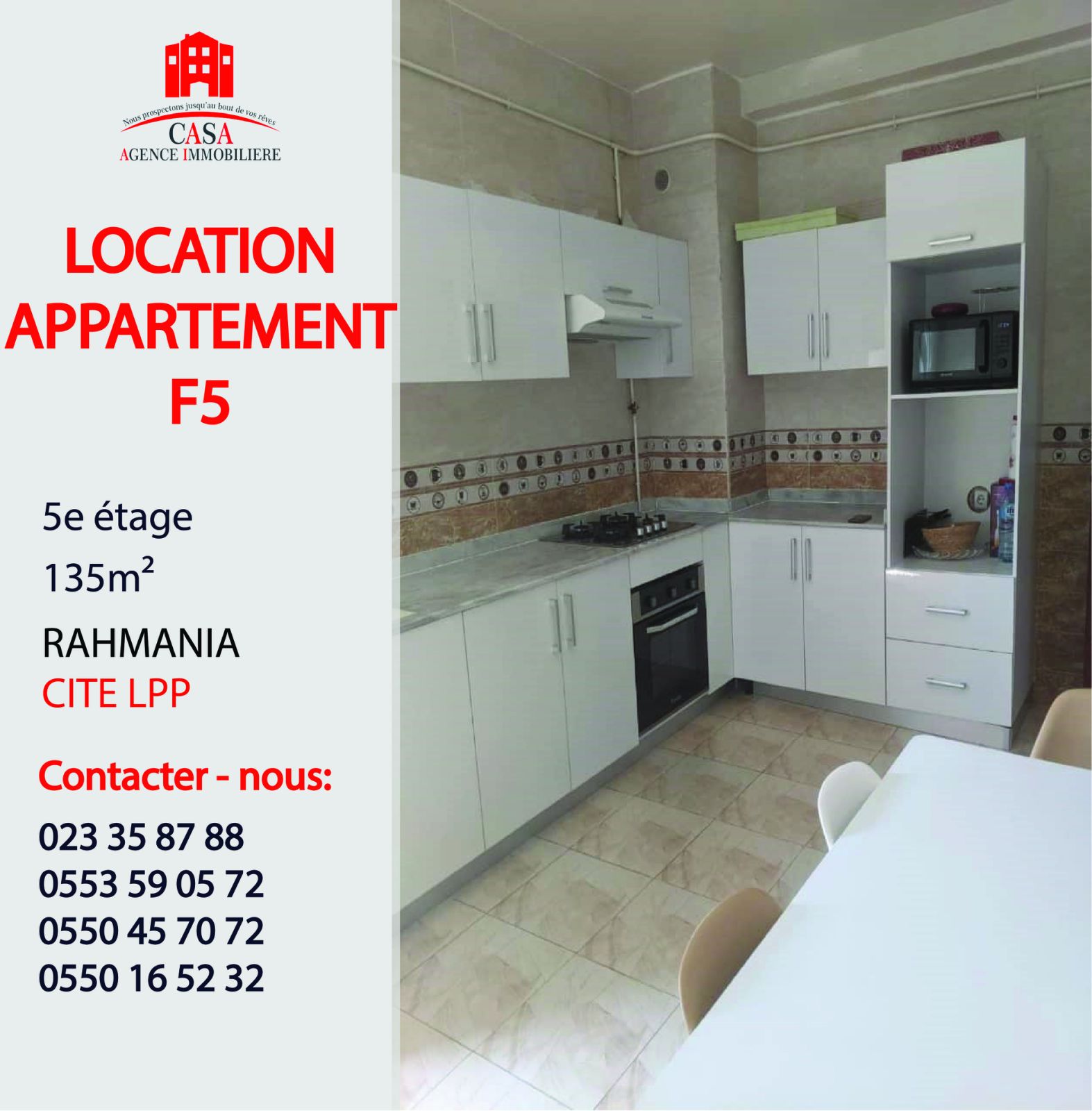 Rahmania, dans une cité LPP, casa immo met en location un bel appartement de type F5 au 5e étage, d’une superficie de 135 m², ensoleillé et avec toutes commodités: chauffage central + une cuisine équipée d’une: plaque chauffante + une hotte + un four + placard de rangement + interphone et climatisations et balcons.